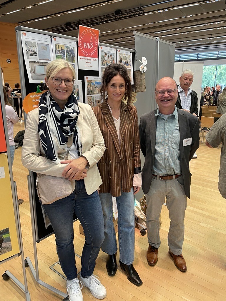 Zwei Jahre nach der erstmaligen Auszeichnung als Hessische Umweltschule konnten Patricia Reimer (Koordinatorin für Nachhaltigkeit an der WKS) und Sandra Baumann-Hey (Stellvertretende Koordinatorin und Projektverantwortliche für das Wildblumen-/Wildbienenprojekt) als Vertreterinnen der Wilhelm-Knapp-Schule erneut die Urkunde aus den Händen des Staatssekretärs Dr. Manuel Lösl (HKM) sowie des Regionalkoordinatoren für die Umweltschulen, Marc Schäm, entgegennehmen. Dies geschah im Rahmen einer zentralen feierlichen Auszeichnungsveranstaltung im Congress Park Hanau, welche in Form eines „Marktplatzes“ organisiert war, so dass sich die Teilnehmenden an den Ständen der insgesamt 136 ausgezeichneten Schulen sämtlicher Schulformen anhand von Fotoausstellungen, Plakatwänden und verschiedenen Exponaten über die vielfältigen Projekte aus den Bereichen Umweltschutz und Nachhaltigkeit informieren konnten.